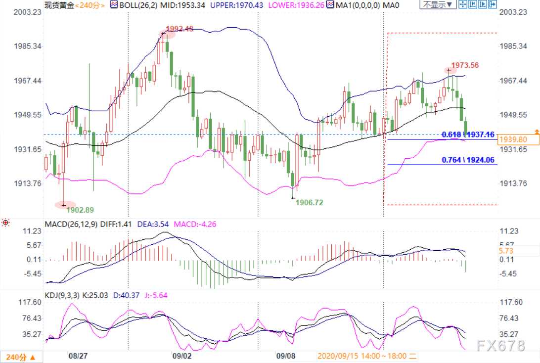 下方初步支撑先留意布林带下轨1936.33,这同时与1902.89-1992.48这波上涨的61.8%回撤位相近;进一步支撑位看向76.4%回撤位1924附近。强支撑下看8月26日低点1902.89。