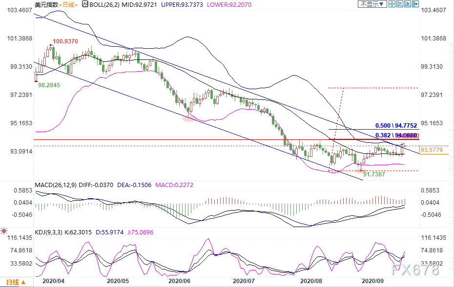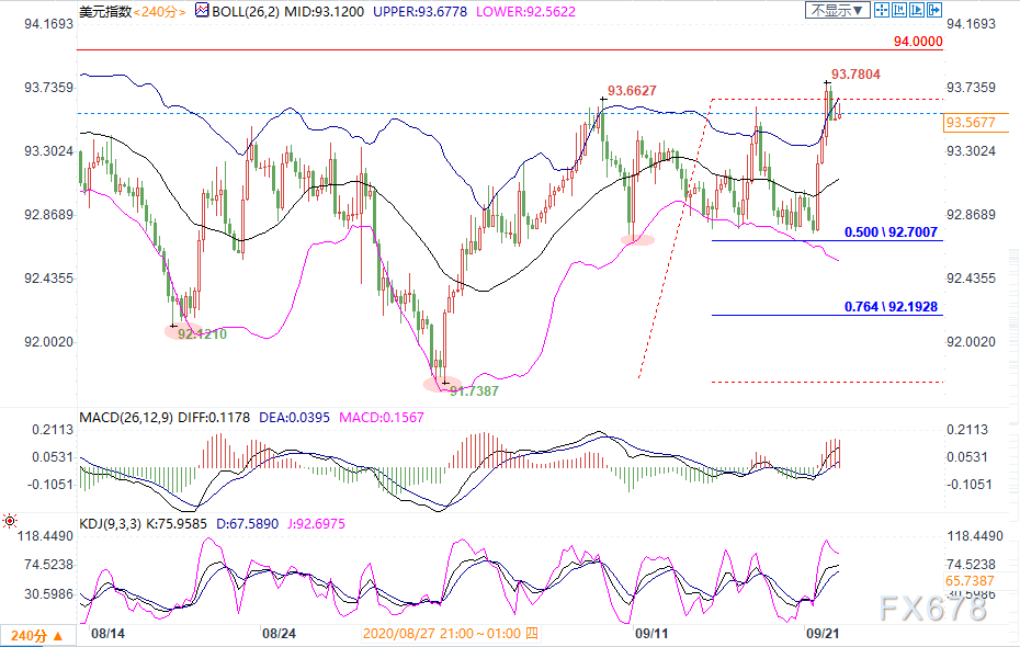 下行方面,先留意布林带中轨93.12,进一步支撑位留意9月10日低点92.70,这同时与布林带下轨、以及91.74-93.66涨势的50%回撤位相重合,参考性较强。强支撑下看8月18日低点92.12,这与76.4%回撤位相近;若该点位失守,甚至可能跌至前期低点91.74。