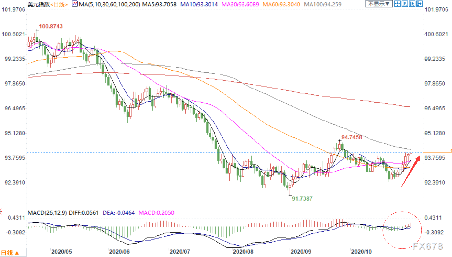 解析:美元指数重心进一步上移,再创一个月新高,一方面拜登胜选预期降温,这可能减弱投资者的宽松预期,另一方面,欧元区经济在第三季从新冠疫情引发的衰退中反弹的幅度远超预期,但由于各国为遏制第二波疫情重新采取限制措施,复苏可能会戛然而止。美国9月消费者支出增幅超过预期,但数千万失业美国人的福利减少、天气降温以及全国各地新增病例数再次飙升,可能会抑制第四季支出。