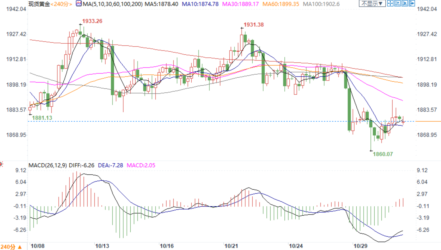 解析:现货黄金止步1880大关,受美元走强和美国经济刺激计划磋商情况不明影响,而对新冠病例激增的担忧和美国大选前的不确定性限制了跌幅。鉴于美国大选仅剩两天时间,而依旧胜负难分,投资者押注分歧巨大,观望情绪浓厚,黄金可能在大选这几日保持震荡局势。