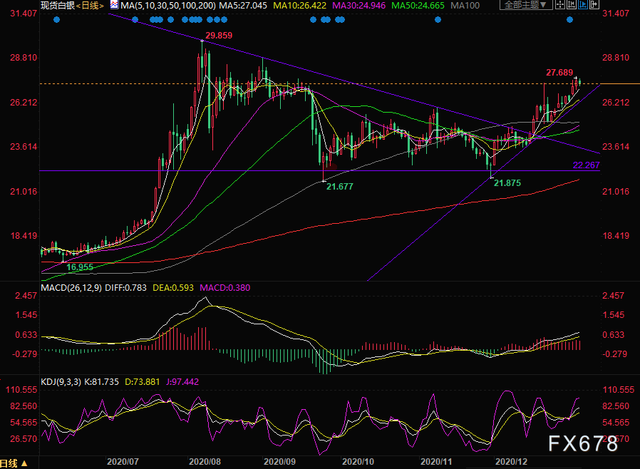 日线级别:KDJ金叉,MACD金叉,不过与黄金一样面临过高的乖离率,短线可能回调,下方初步支撑在5日均线27.03,进一步支撑在10日均线26.41,2020年11月9日高位26是强支撑。上方阻力可以关注周二高点27.68,进一步关注28关口。
