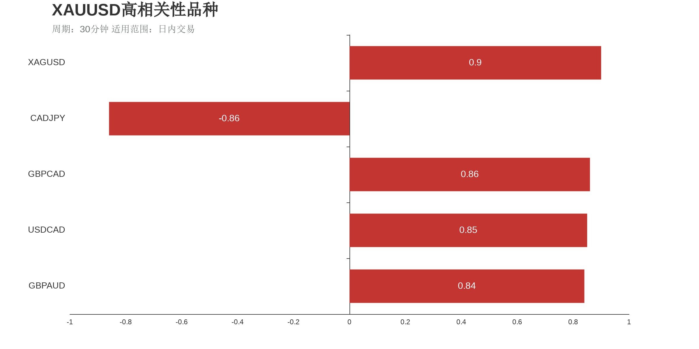根据外汇相关性实时追踪,XAUUSD在30分钟周期下与部分货币的相关性排行如下图: