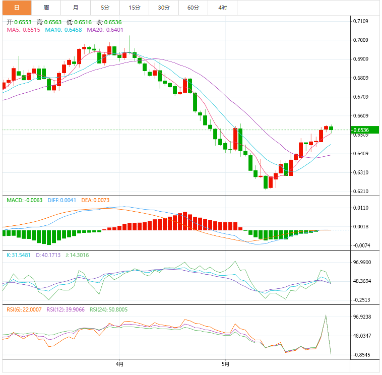 技术分析,纽元兑美元从50日移动均线拉回,截至发稿时约为0.6565,但从5月中旬开始,一条向上倾斜的支撑线接近0.6510,测试该货币对的卖方。