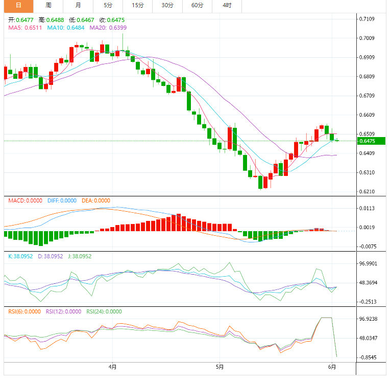 技术分析,三周支撑线和21日均线限制了纽元兑美元在0.6470附近的短期下行。然而,在升破5月高点0.6570之前,复苏走势仍然难以捉摸。