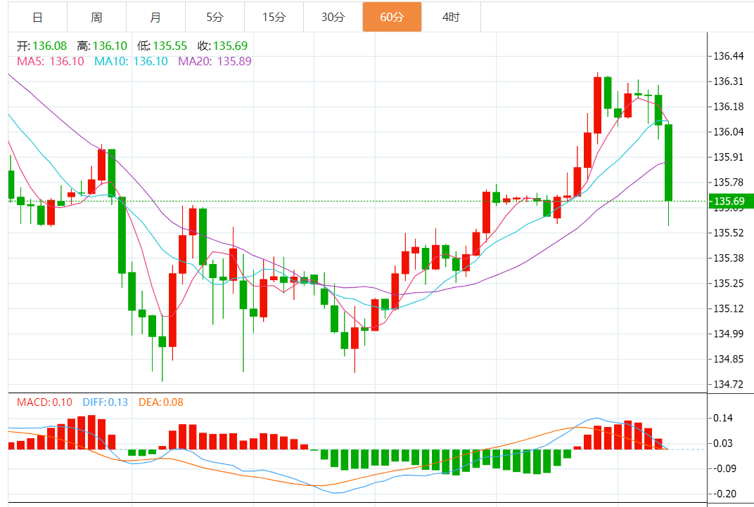 技术图形上, 4小时图在MA100一线整理,目前已将汇价拉回20期均线上方,显示美元多头动能仍未消退,当前汇价在134.70附近受到较强的支撑。