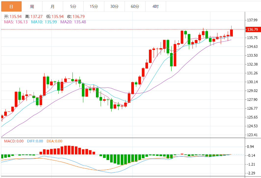 美元兑日元在亚洲交易时段大幅上涨,最后在137.00附近的日内高点整理涨幅。日线图上,美元兑日元继续在134.70之上震荡横盘,虽然前两周都曾出现吞没线出现,且技术指标产生背离迹象,都未能走出像样的大幅回撤行情。近期还是要留意上方137.00历史阶段的高位阻力情况,若突破上方有望进一步走高一线。下方则留意近期横盘的下方支撑134.70水位的力度,若彻底刺穿,或有望走出较大幅度的回撤行情。