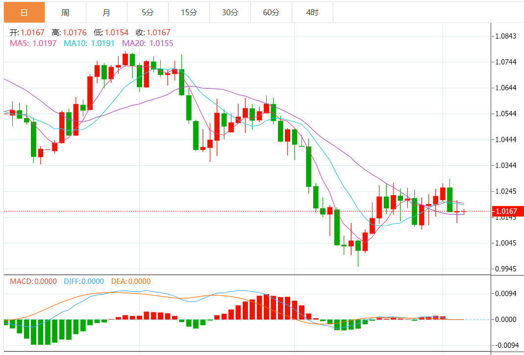 此前因美国联邦储备理事会(美联储/FED)官员暗示将积极加息,显然为市场认为美联储在加息道路上已走得太远降温,美元为此也是受到相应的支撑。随后周五的非农的数据将登场,看看能否佐证美联储官员的看法。欧元兑美元继续小幅偏弱势下行。日图重新回到1.0100 -1.0280区间支持附近,随机指标倾向走低,但需要向下破位才能明确进一步方向。4小时图在MA200受阻回落,动能仍有限。小时图连续下行,短期均线空头排列,关注1.0150一线支持。