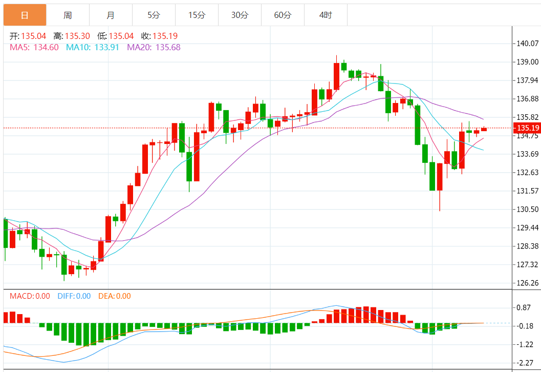 预期交易区间在 134.50 支撑位和 135.80 阻力位之间
