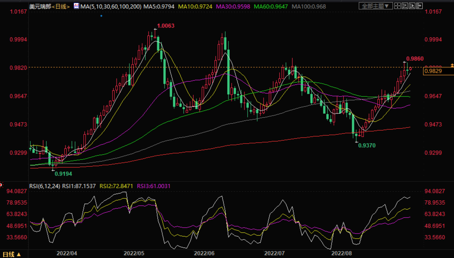 8月初的高点在0.9650附近震荡,在引导美元兑瑞郎空头走向0.9370附近的前一个月低点之前,也起到了下行支撑的作用。