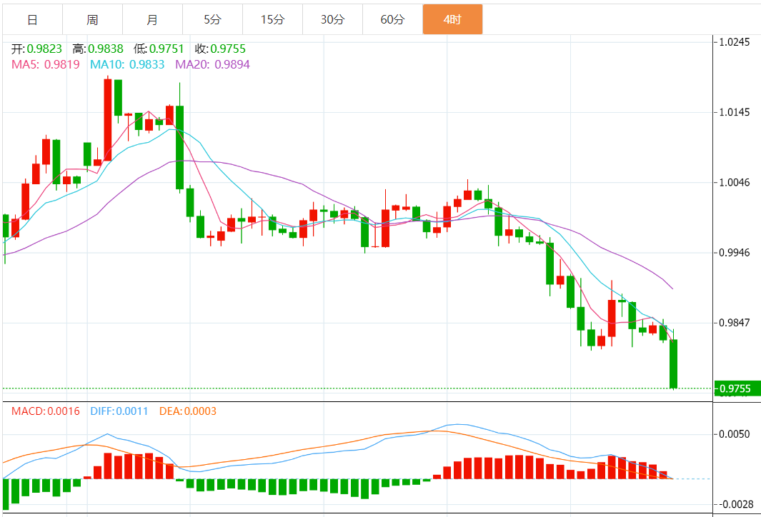 周五欧盘,欧元/美元回调,跌破0.9800关口,现交投于0.9760,日内下跌0.75%。从4小时图来看,50周期指数移动平均线(EMA)支持看空预期。需要提醒的是,欧元/美元保持在0.9880下方对于实现上述看空目标相当重要。