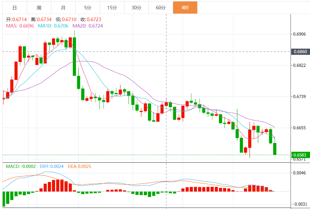 周五欧盘,澳元/美元走低,跌破0.6600关口,现交投于0.6587,跌幅0.86%。从4小时图来看,目前随机指标传递明显的看空信号。需要指出的是,澳元/美元延续看空走势的条件是该货币对保持在0.6700下方。