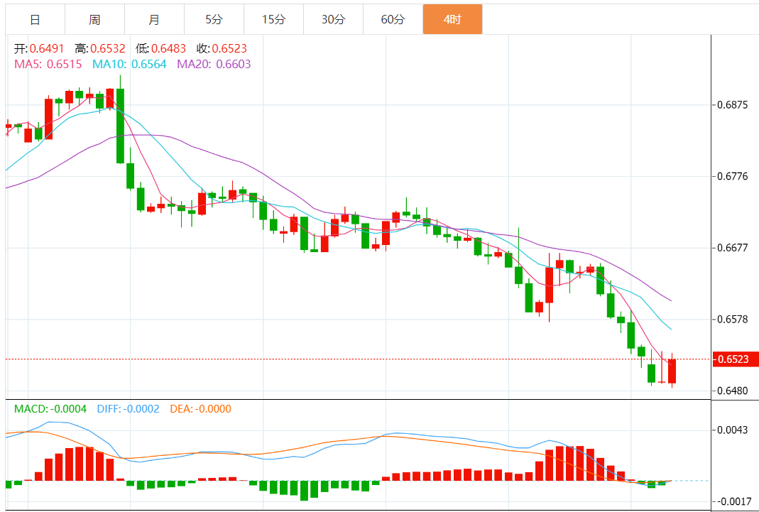 欧市盘中,澳元/美元交投于0.6519附近,跌幅0.14%。从4小时图来看,澳元/美元在未来一段时间处于看空趋势。需要意识到的是,若澳元/美元反弹突破0.6535,这可能推动该货币对测试0.6610,然后重新尝试下跌。