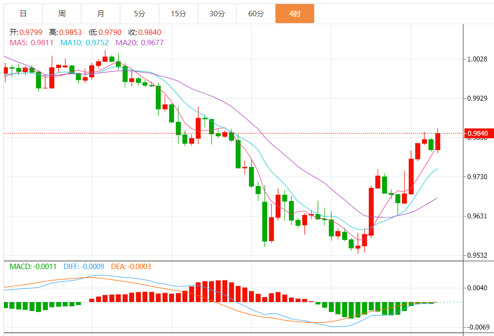 欧元兑美元在周五早间突破0.9830刷新本周高点,但失去上涨动能。汇价目前小幅下跌至0.9800附近。欧元区9月调和通胀率年率料上升至9.7%,前值9.1%。週四德国统计局发布的报告显示德国消费者物价指数年率跃升至10%,高于市场预期9.4%。从4小时图来看,预测欧元/美元今日将呈看涨倾向。需要指出的是,若欧元/美元跌破0.9790,这将止住预期中的升势,并推动该货币对再度下跌。