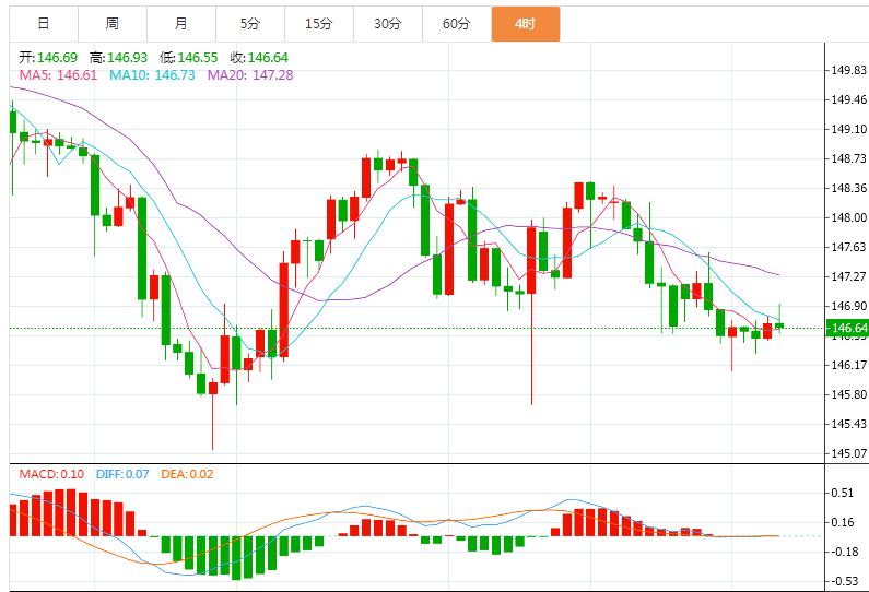 从4小时图来看,50周期EMA形成看空压力。需要指出的是,美元/日元继续看空走势的条件是该货币对保持在147.17-147.50下方。预计今日美元/日元交投将位于支撑位145.80以及阻力位147.20之间。