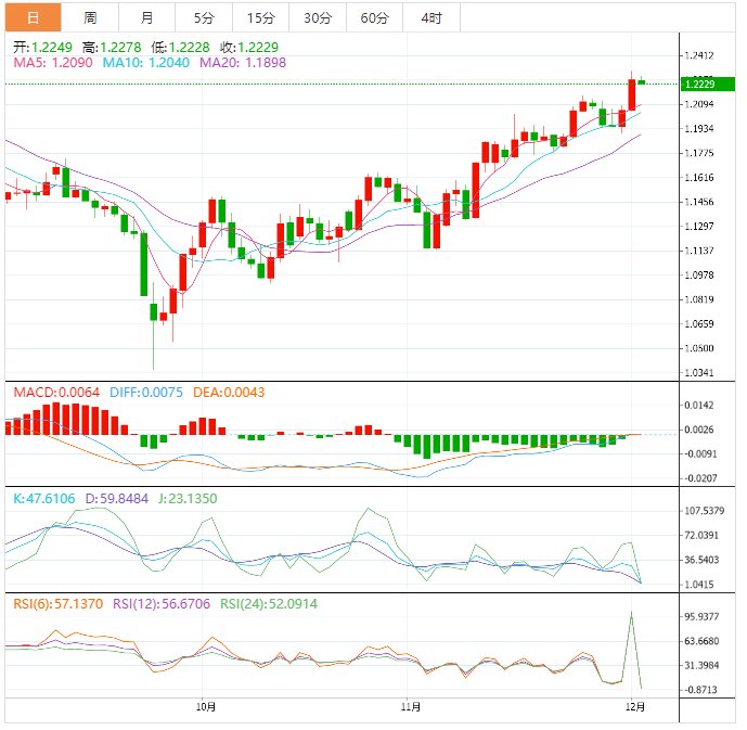 同样挑战英镑兑美元多头的还有10月初的向上倾斜阻力线,目前在1.2280附近。
