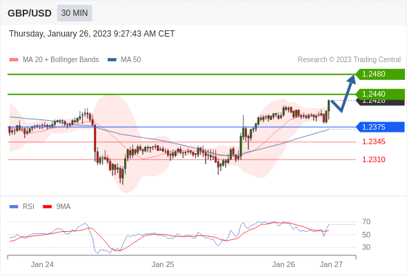 在 1.2375 之上,看涨,目标价位为 1.2440 ,然后为 1.2480 。 在 1.2375 下,看空,目标价位定在 1.2345 ,然后为 1.2310。