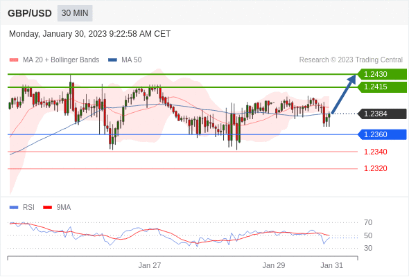 在 1.2360 之上,看涨,目标价位为 1.2415 ,然后为 1.2430 。 在 1.2360 下,看空,目标价位定在 1.2340 ,然后为 1.2320。