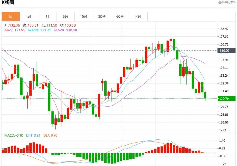 今日周四,欧元兑美元报1.0904,涨幅0.46%;英镑兑美元报1.2324,涨幅0.51%;美元兑日元报130.72,跌幅0.51%。