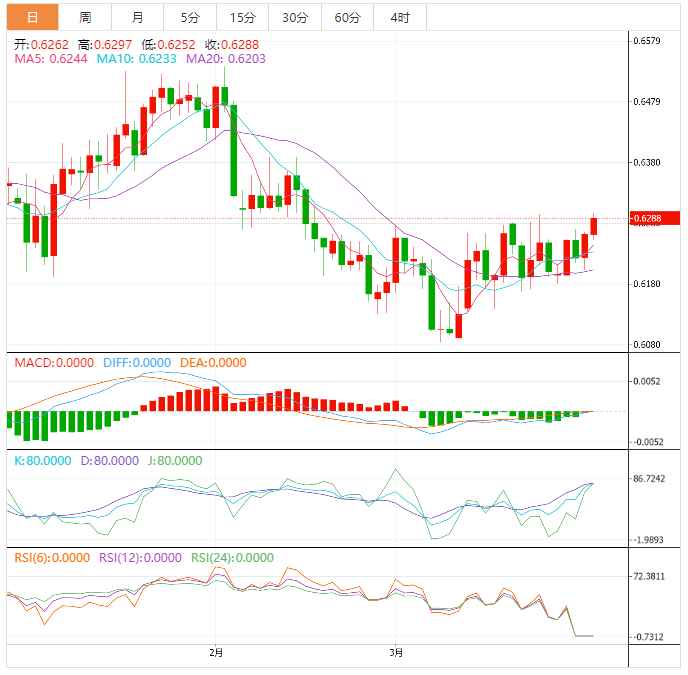 如果该货币对突破3月29日的高点0.6272,将推动该货币对冲向3月23日的高点0.6295,随后是2007年2月的高点0.6363。