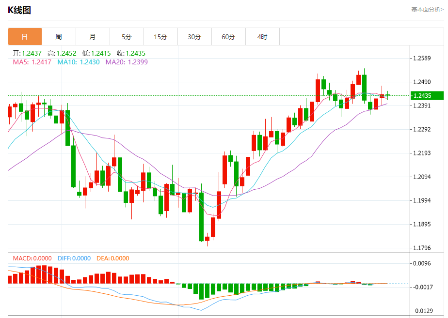 汇价高见1.2452,低见1.2415。上一交易日,汇价收于1.2438。