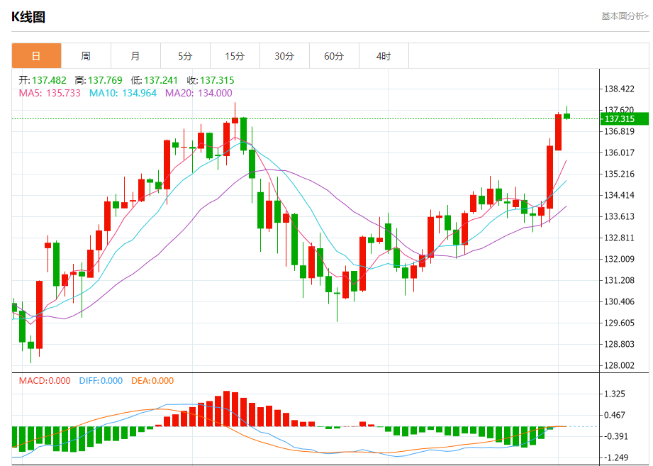 汇价高见137.769,低见137.241。上一交易日,汇价收于137.455。