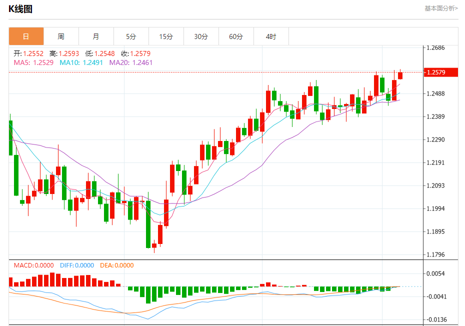 汇价高见1.2593,低见1.2546。上一交易日,汇价收于1.2546。