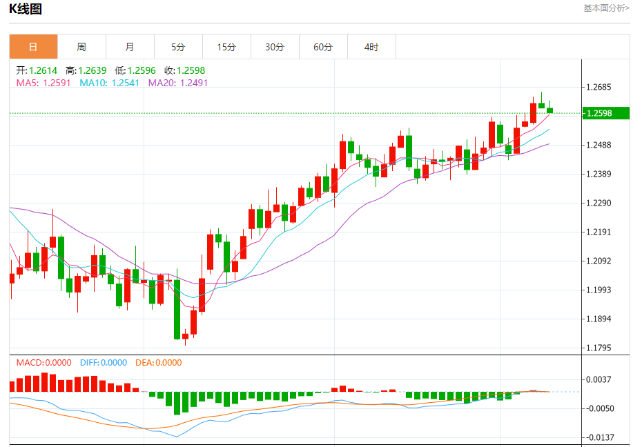 汇价高见1.2639,低见1.2596。上一交易日,汇价收于1.2614。