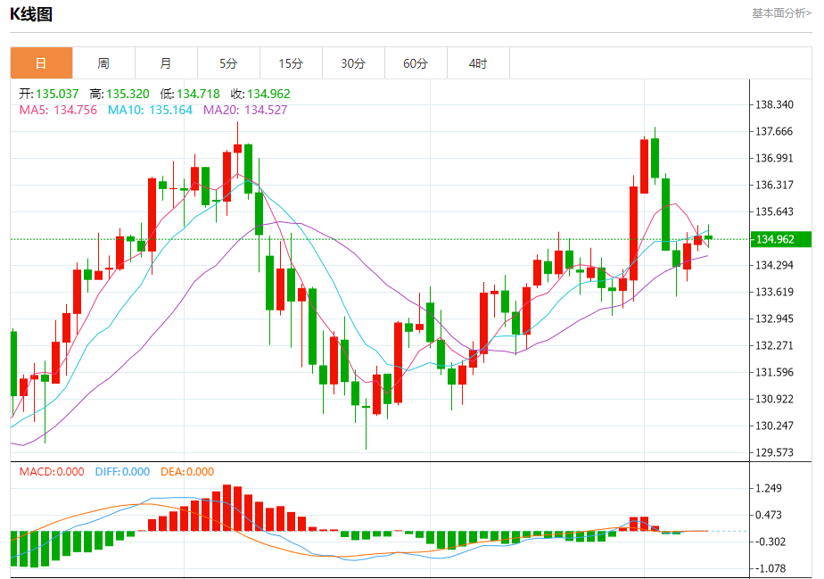 汇价高见135.321,低见134.718。上一交易日,汇价收于135.033。