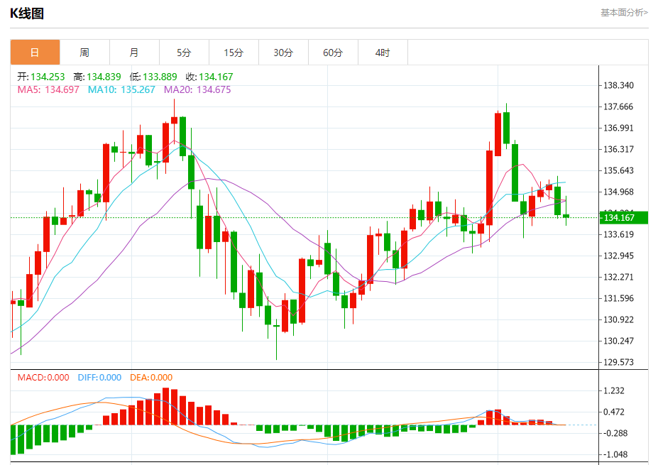 汇价高见134.839,低见133.889。上一交易日,汇价收于134.249。