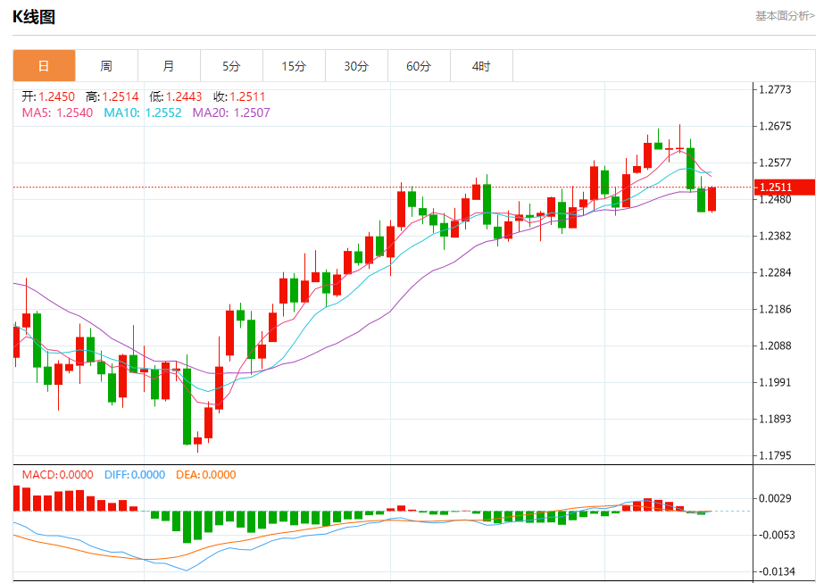 汇价高见1.2514,低见1.2443。上一交易日,汇价收于1.2447。