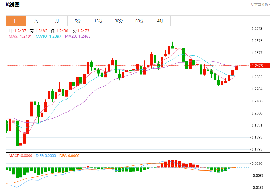汇价高见1.2482,低见1.2400。上一交易日,汇价收于1.2437。