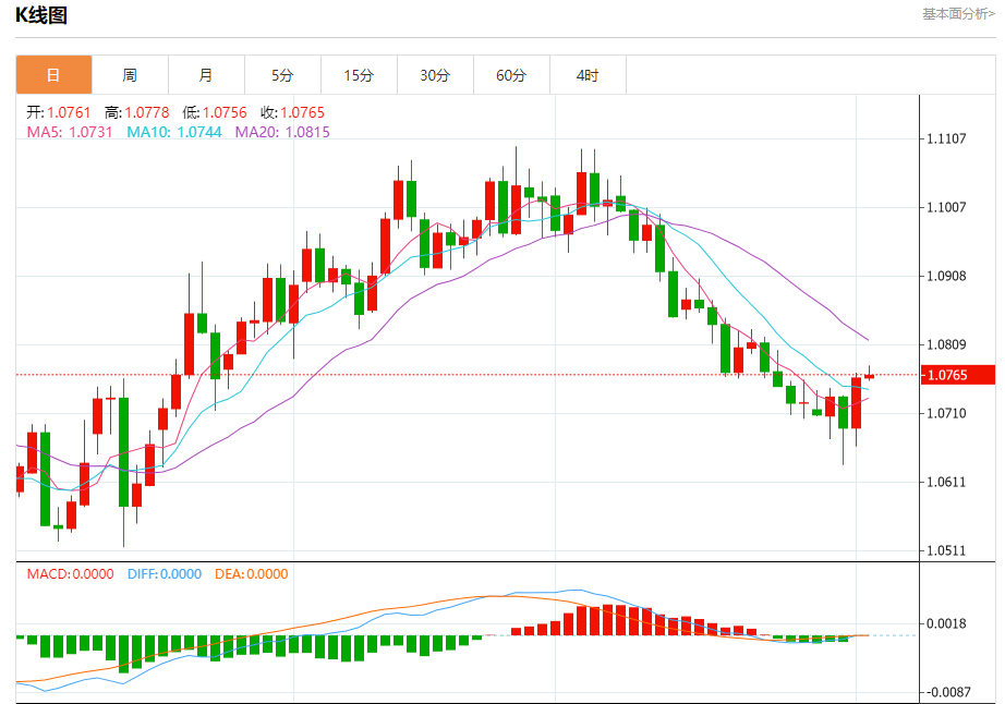 汇价高见1.0779,低见1.0756。上一交易日,汇价收于1.0761。