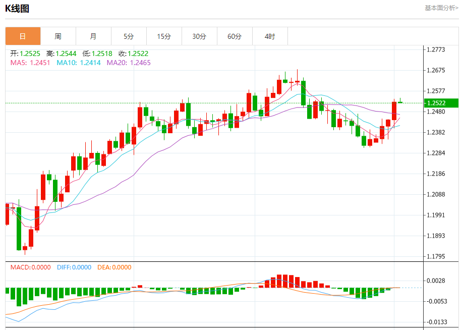 汇价高见1.2544,低见1.2519。上一交易日,汇价收于1.2522。