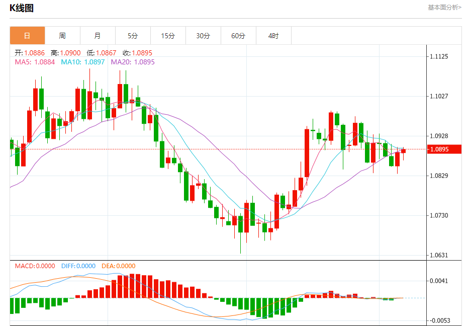 汇价高见1.0900,低见1.0867。上一交易日,汇价收于1.0887。