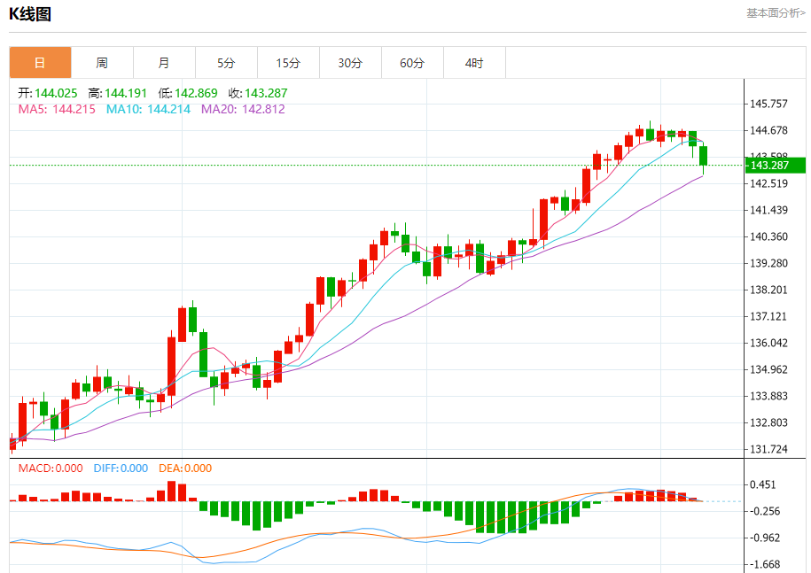 汇价高见144.193,低见142.869。上一交易日,汇价收于144.057。