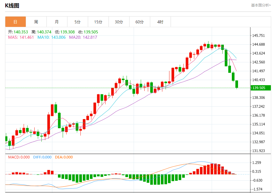 汇价高见140.374,低见139.308。上一交易日,汇价收于140.353。