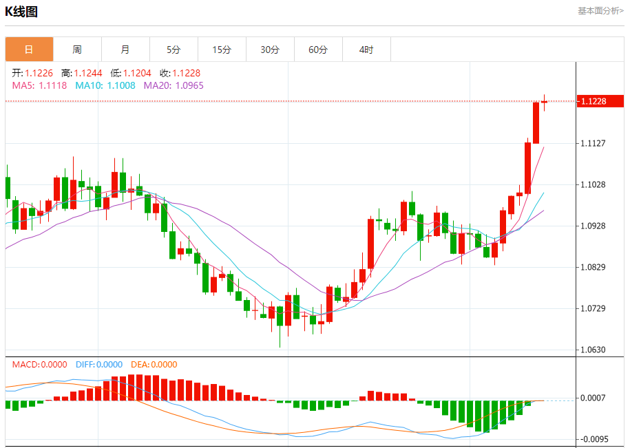 汇价高见1.1245,低见1.1204。上一交易日,汇价收于1.1225。