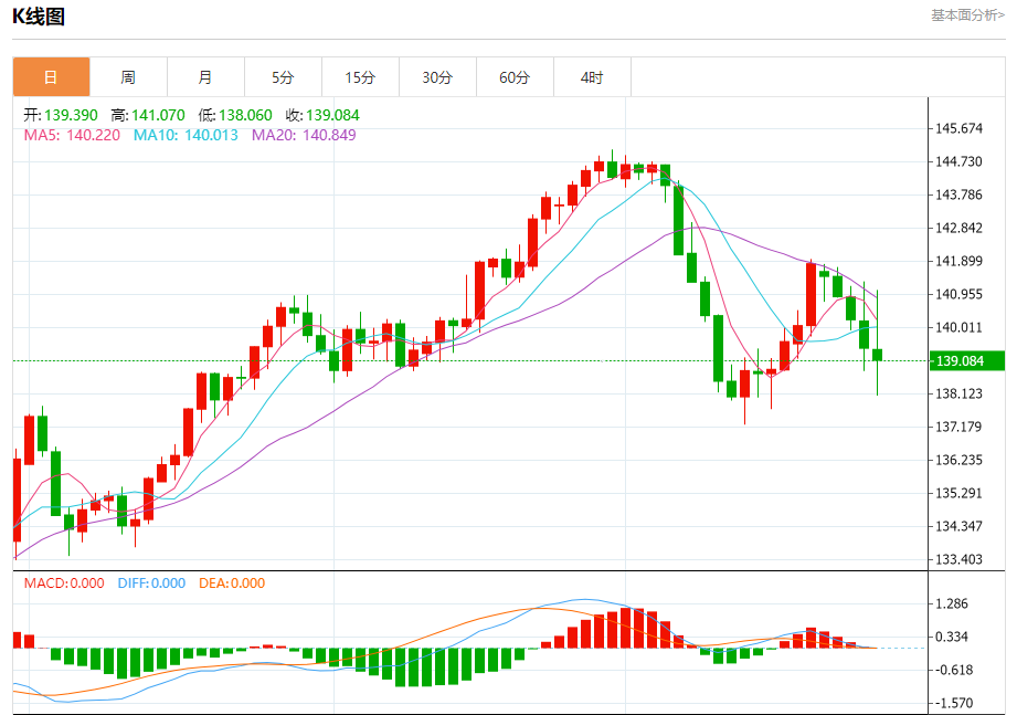 汇价高见141.070,低见138.060。上一交易日,汇价收于139.424。