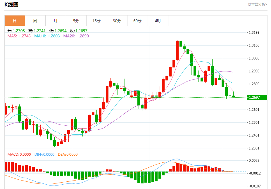 汇价高见1.2741,低见1.2694。上一交易日,汇价收于1.2708。