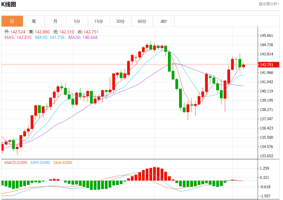 汇价高见142.880,低见142.310。上一交易日,汇价收于142.517。