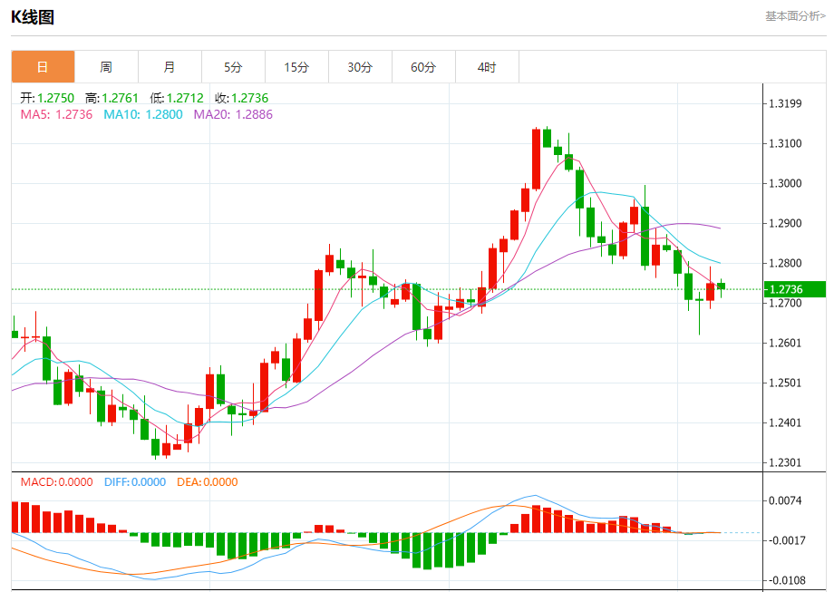 汇价高见1.2761,低见1.2712。上一交易日,汇价收于1.2750。