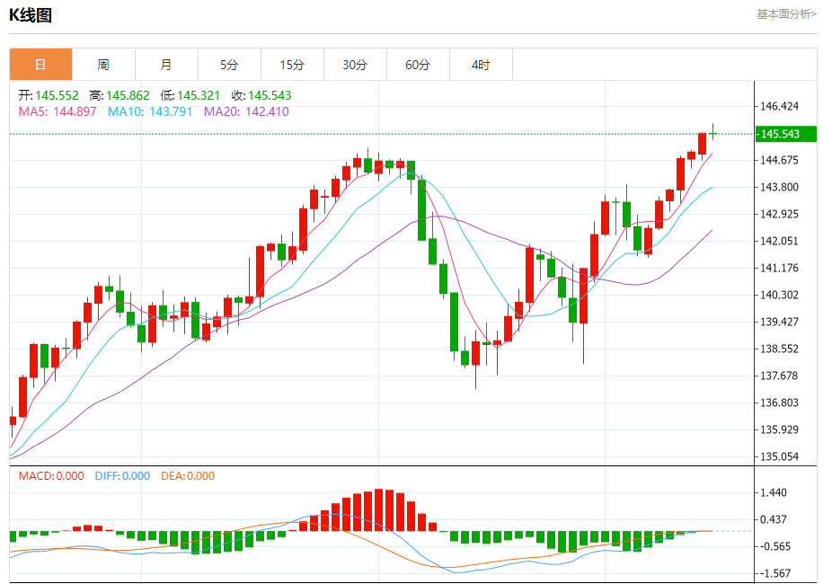 汇价高见145.862,低见145.321。上一交易日,汇价收于145.546。