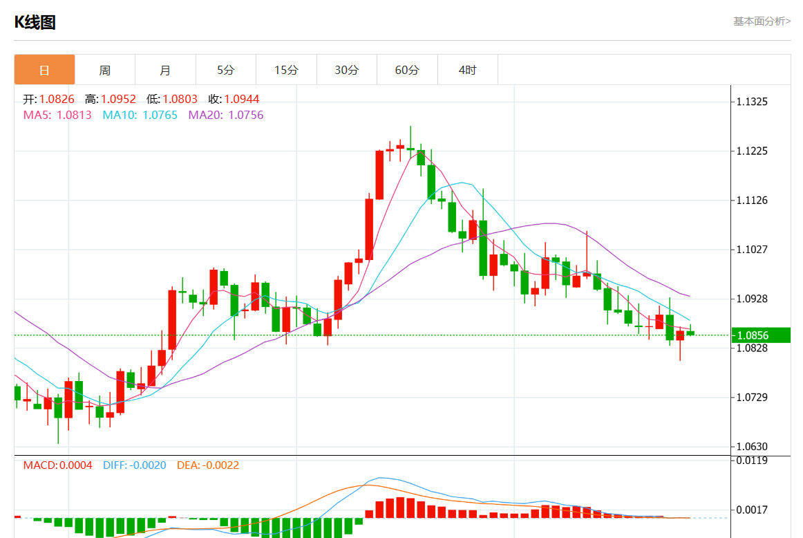 周四欧市盘中,欧元/美元最新报1.0855,日图跌0.07%