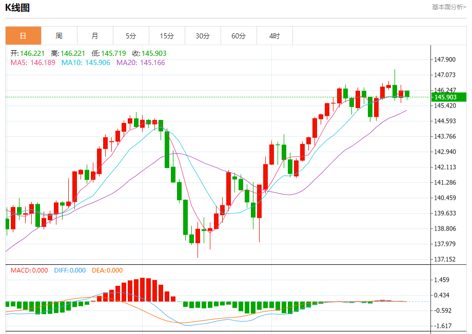 汇价高见146.221,低见145.719。上一交易日,汇价收于146.225。