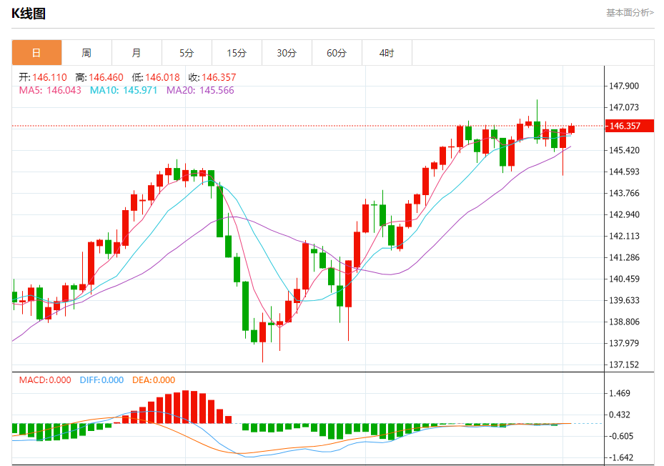 汇价高见146.458,低见146.018。上一交易日,汇价收于146.251。