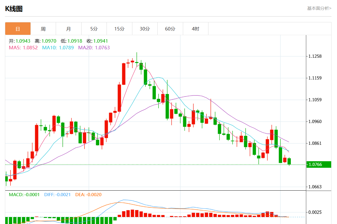周二欧市盘中,欧元/美元最新报1.0759,日图跌0.33%