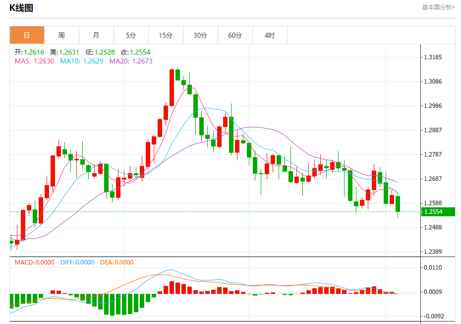 汇价高见1.2631,低见1.2528。上一交易日,汇价收于1.2620。