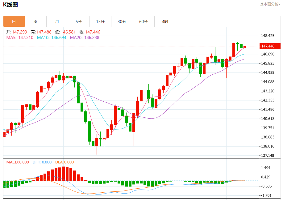 汇价高见147.487,低见146.581。上一交易日,汇价收于147.283。