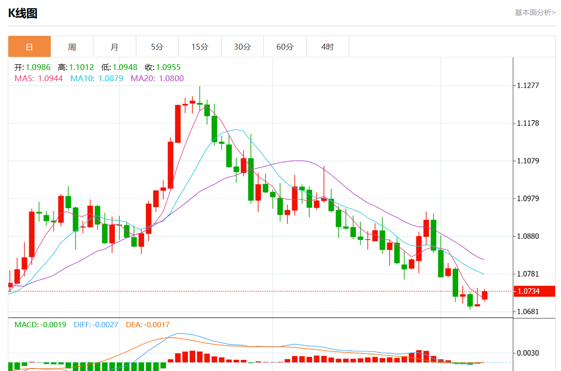 周一欧市盘中,欧元/美元最新报1.0732,日图涨0.30%