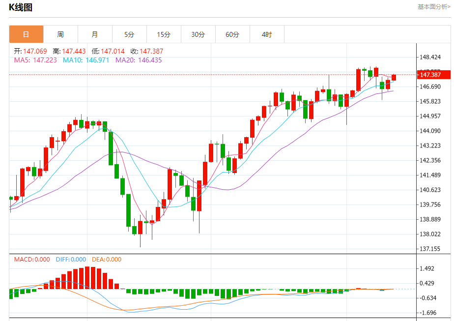 汇价高见147.443,低见147.014。上一交易日,汇价收于147.079。